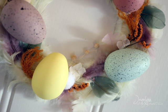 Og ellers har jeg laget en påskekrans av en utklippet og malt pappsirkel, fjær, tørkede planter og plast- egg.
